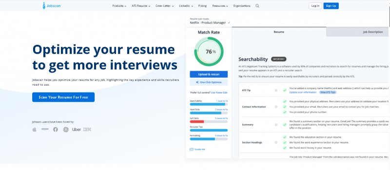 Users upload a resume and paste or import a job description. Jobscan’s algorithms analyze the content to calculate a match score based on keyword presence, skills alignment, and formatting factors that influence ATS readability. Users receive a score with prioritized recommendations, such as which terms to add, sections to adjust, or phrases to emphasize. Optional features include LinkedIn profile optimization, cover letter suggestions, and personalized resume templates.