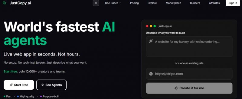 JustCopy.ai uses AI agents to generate full‑stack applications, content, and websites in minutes from simple prompts. Users can export code to GitHub and publish on custom domains.