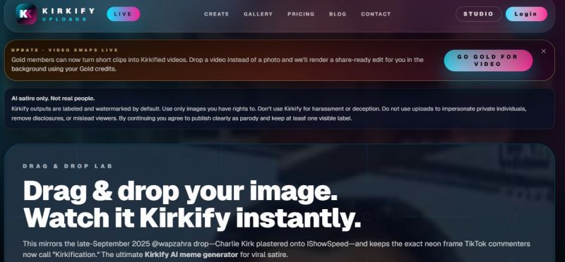 Kirkify focused on producing the viral “Kirkified” meme format satirical visuals where an uploaded image is transformed with a specific face swap effect inspired by the Charlie Kirk meme trend. The site lets creators upload photos, apply an AI-powered transformation, and export ready-to-share memes with built-in satire labeling and neon-styled aesthetics. Basic usage offers a free watermarked result, while paid options unlock HD output and priority processing.