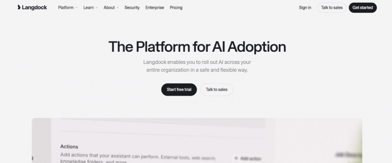Langdock enables rollout of AI across organizations through an all-in-one platform. It provides chat, assistants, integrations, workflows, API access to models, and security features. The platform supports enterprise deployment, allowing developers to build and distribute custom AI workflows. Models from major providers integrate without lock-in, hosted in the EU and US. Workflows automate repetitive tasks with human-in-the-loop controls. Assistants handle specific use cases like support queries, documentation drafting, and data analysis. Security includes dedicated deployment options and compliance measures.