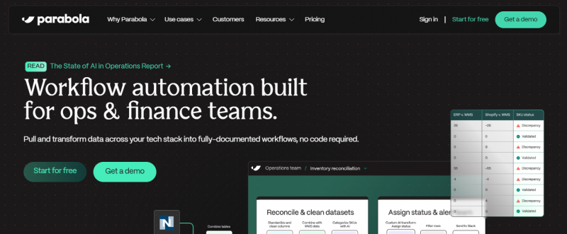 Parabola organizes and transforms messy data from multiple sources1PDFs, emails, spreadsheets, APIs, and databases1into standardized formats without requiring custom code. The platform combines workflow automation with AI-powered data extraction and standardization, enabling teams to replace repetitive manual processes with reliable, auditable workflows. Built for recurring operations involving complex logic and disparate data sources, such as invoice auditing, report generation, and discrepancy alerts, Parabola emphasizes accessibility for non-technical users while integrating with enterprise systems like ERPs and data warehouses.