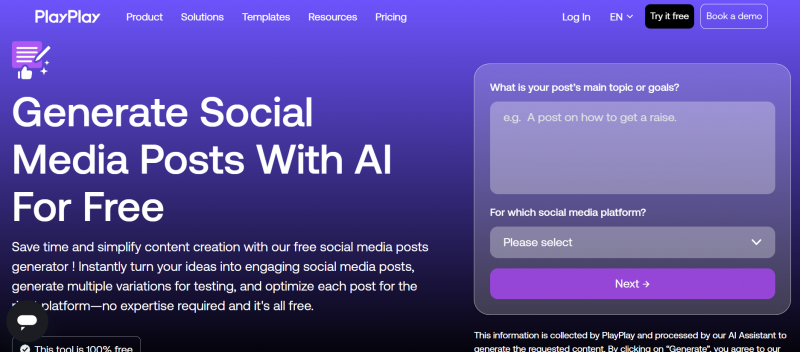 PlayPlay’s AI Social Media Post Generator is a free tool designed to help marketers, content creators, and social media managers quickly produce engaging social media captions and posts. From a simple topic prompt, the AI generates multiple tailored text variations optimized for major platforms like LinkedIn, Instagram, Facebook, Twitter/X, TikTok, and YouTube Shorts. It includes selections for tone, language, and target audience, returning ready-to-use captions that can be edited before posting. The generator supports multi-language output and is desktop-only. PlayPlay also provides seamless integration with its broader AI video creation suite, enabling users to turn text into videos with motion design, stock visuals, and brand customization. This makes it useful for teams that want quick post ideas and content formats without deep copywriting expertise.