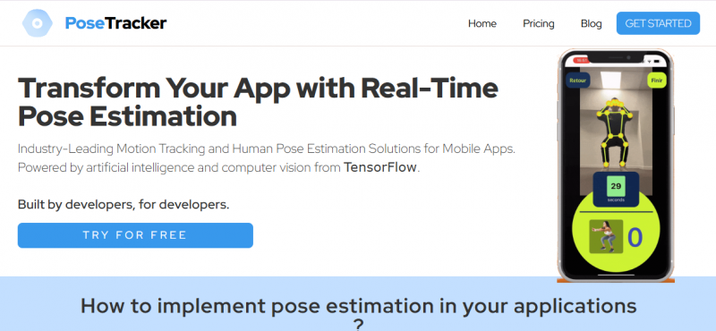 PoseTracker API enables real-time pose estimation by detecting 17 key body points from camera feeds. It processes movements for analysis, including posture feedback and repetition counting for exercises like squats, lunges, and push-ups. Integration occurs via WebView or iFrame across iOS, Android, and web applications, with on-edge processing for zero latency and no data transfer. The API uses TensorFlow's MoveNet model and supports pixel tracking for custom image handling. Plans include a free tier limited to 500 calls monthly and a developer plan with angle calculations and recording up to 5,000 calls.
