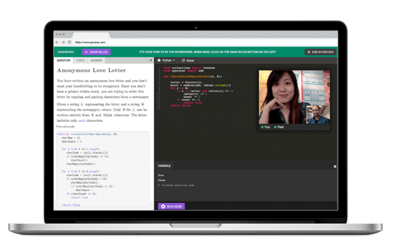 Pramp is an interview practice platform that connects candidates for live, structured mock interviews. Users are matched with peers based on role, experience level, and interview type. Sessions replicate real interview conditions by combining video calls with shared coding environments, allowing participants to practice both technical problem-solving and communication skills. The platform focuses on building interview confidence through repeated, real-time practice.