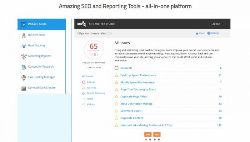 Raven Tools is a cloud based SEO and marketing analytics suite that lets agencies, marketers and freelancers centralize SEO, PPC and social data into automated, white label reports. It combines technical site audits, rank tracking, backlink analysis and multi channel integrations so teams can surface insights and share branded dashboards without stitching together exports from multiple platforms. The focus on reporting automation and high crawl and keyword limits makes it particularly suited to agencies managing many client sites at once.