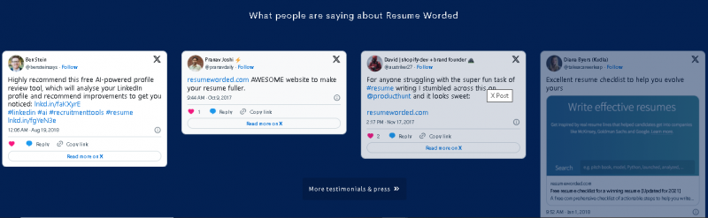 Resume Worded Pro is a career optimization tool designed to help job seekers improve the structure, content, and visibility of their resumes and LinkedIn profiles. The platform evaluates uploaded documents against recruiter criteria and job description benchmarks, providing a quantifiable score along with suggestions for improvements. Its templates and examples are designed to enhance ATS compatibility and increase the chances of recruiter engagement.