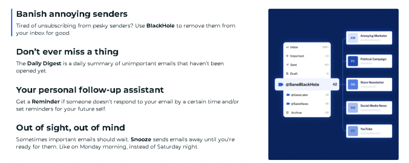 SaneBox is an email inbox management service designed to reduce clutter and help users focus on what matters by filtering unimportant messages into separate folders. It integrates with existing email providers without replacing the email client itself. Users can get daily summaries, mute unwanted senders, defer messages, and set follow‑up reminders, streamlining how email is processed and reducing time spent sorting and reviewing messages.