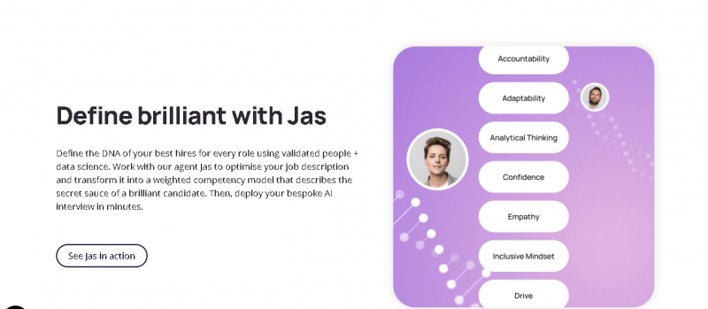 Its structured interview framework is designed using validated people science, providing consistent measurement of competencies, behaviors, and language.