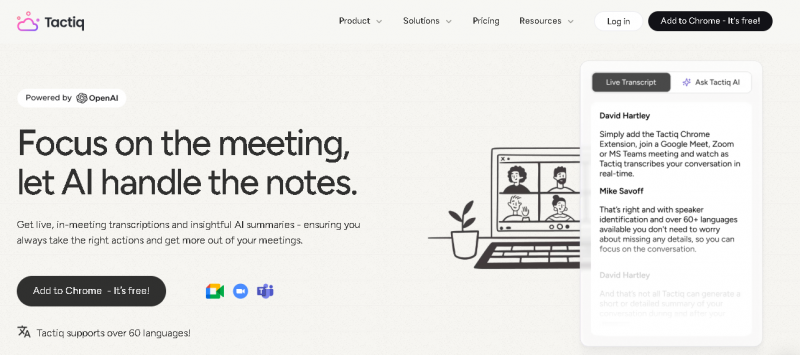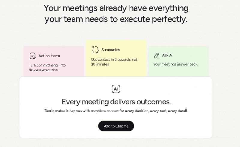 Tactiq is a meeting productivity tool designed to capture, transcribe, and summarize conversations from online meetings. It works alongside popular video conferencing platforms to generate real-time transcripts and post-meeting summaries without requiring meeting recordings. The platform helps teams document discussions, track decisions, and follow up on action items using searchable transcripts. Tactiq is commonly used by remote teams, sales professionals, product managers, and customer-facing roles that rely on accurate meeting documentation.