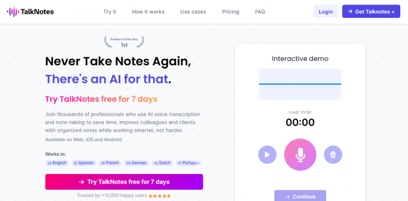 Talknotes transcribes voice notes into structured text such as task lists, transcripts, and actionable items. Users record audio, select from over 100 premade styles or create custom ones, then edit and organize the output. It processes meetings, interviews, brainstorming sessions, content creation, journaling, and study notes. Audio upload supports up to 20 minutes on Plus or 2 hours on Pro plans. Available on web, iOS, and Android with sync across devices. Supports 50+ languages with auto-detection. Notes export to text, email, or shareable URL.