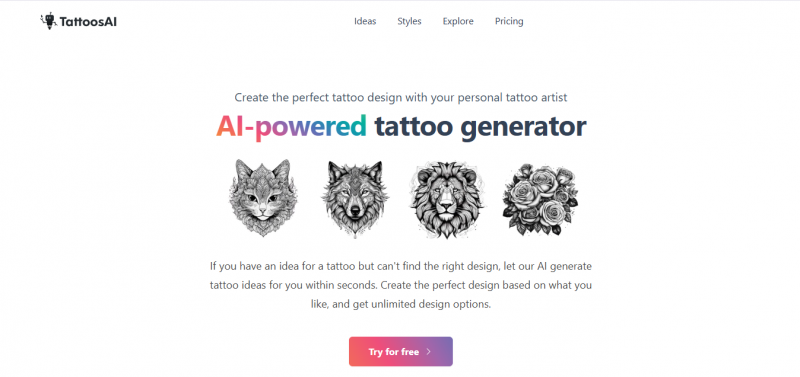 TattoosAI generates tattoo ideas from user input within seconds. Users describe their tattoo concept, select style and color from available options, and receive unique design concepts. The process follows three steps: input an idea, choose style such as dotwork or minimalist, and obtain AI-generated designs. It provides unlimited design options and acts as a personal tattoo artist. Access includes permanent cloud storage and a personal AI tattoo designer for 365 days.