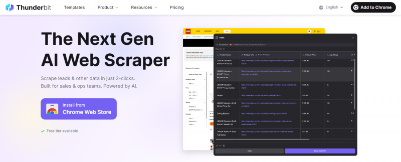 Thunderbit automates the extraction of structured data from websites with minimal setup. At its core, the platform combines pre‑built templates and AI logic to turn unstructured web content into usable spreadsheets or database inputs with just two clicks. Users can start with a free tier and scale into paid plans as needs grow.