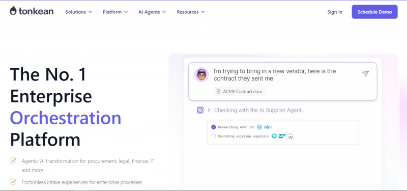 Tonkean automates and orchestrates business processes end to end, engaging stakeholders and updating relevant systems to fulfill employee requests. It keeps humans in the loop at critical decision and approval points, unlike traditional automation platforms that rely on naive if-then sequences. The platform enables employees to submit requests via familiar channels like email, Slack, Microsoft Teams, and forms. It builds state-driven asynchronous flows for scenarios with unknown timing, such as long lead approvals, and monitors tech stack states across systems using a declarative approach. Tonkean wraps around 250+ applications, synchronizing data and automating approvals without replacing existing tools. No-code tools support process building, dashboard creation, and integrations for procurement, legal, and other workflows.
