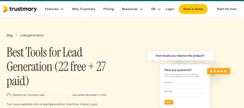 Trustmary is a customer feedback and review management platform that also includes built-in lead generation tools to help businesses turn visitor interest into actionable sales leads. It’s aimed at small to mid-sized companies, marketers, and customer success teams that want to capture more prospects directly from their website while using social proof as conversion fuel. Trustmary collects customer feedback via surveys and review forms, aggregates third-party reviews, and lets you showcase these testimonials across your site with interactive widgets. Its lead generation tools—such as forms, pop-ups, chatbots, and calls-to-action—are designed to capture contact information and elevate engagement without needing separate software.