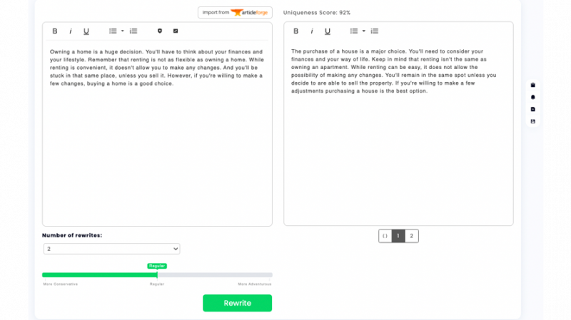 Bulk rewriting plus built‑in plagiarism detection.
